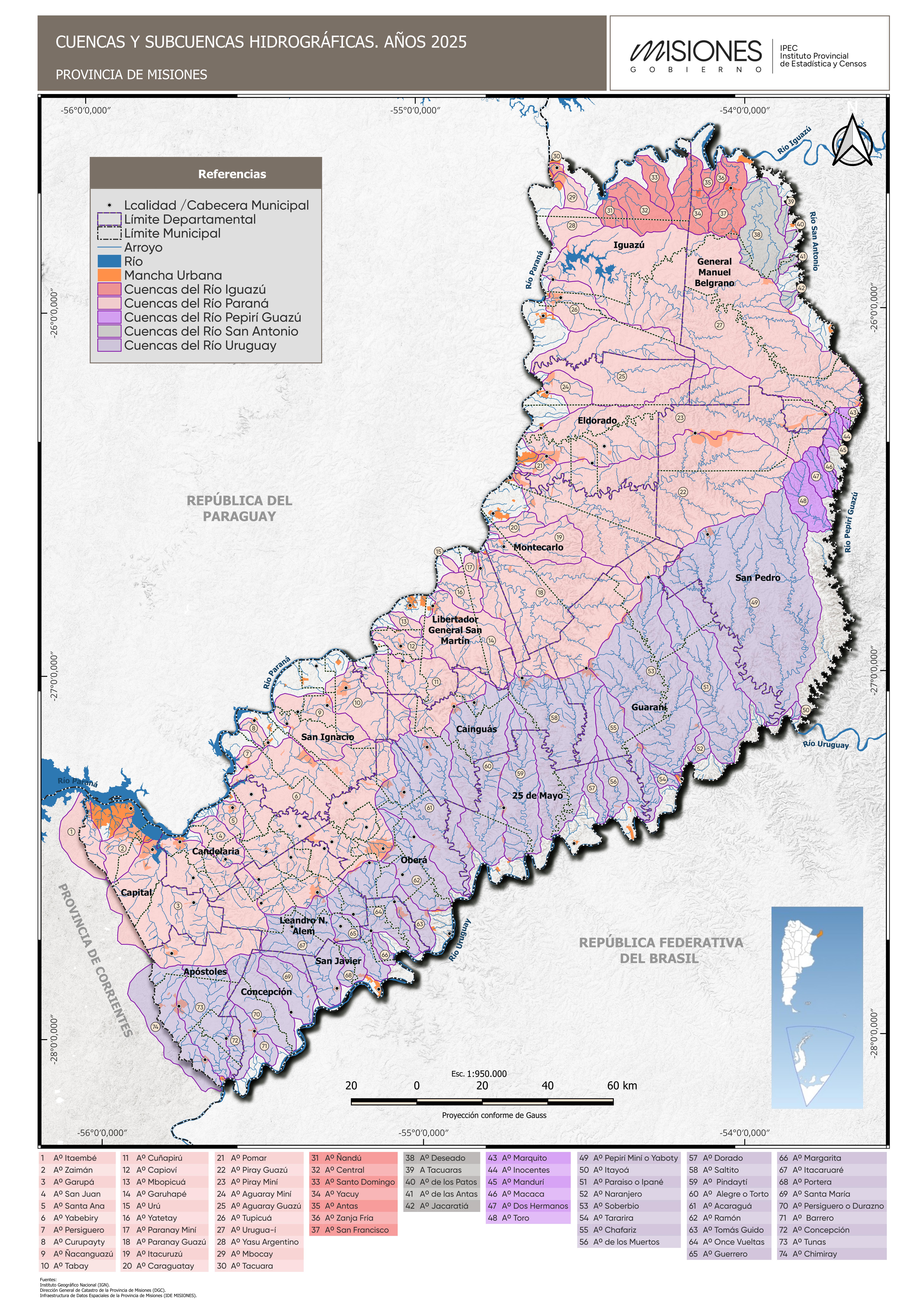EL IPEC Cuencas y subcuencas hidrográficasEL IPECServicios y herramientasMapotecaCuencas y subcuencas hidrográficas 26/08/2025Facebook Twitter WhatsApp Imprimir Mapa de Cuencas y subcuencas hidrográficas. Año 2025. Provincia de Misiones. PDFMapa de Cuencas y subcuencas hidrográficas. Año 2025. Provincia de Misiones. JPG Información relacionada EL IPECMapa de hospitales en Misiones por zona sanitaria EL IPECEscuelas de frontera Información destacadaMapa político escolar de Misiones actualizado EL IPECPoblación Rural por municipio EL IPECPoblación por municipio