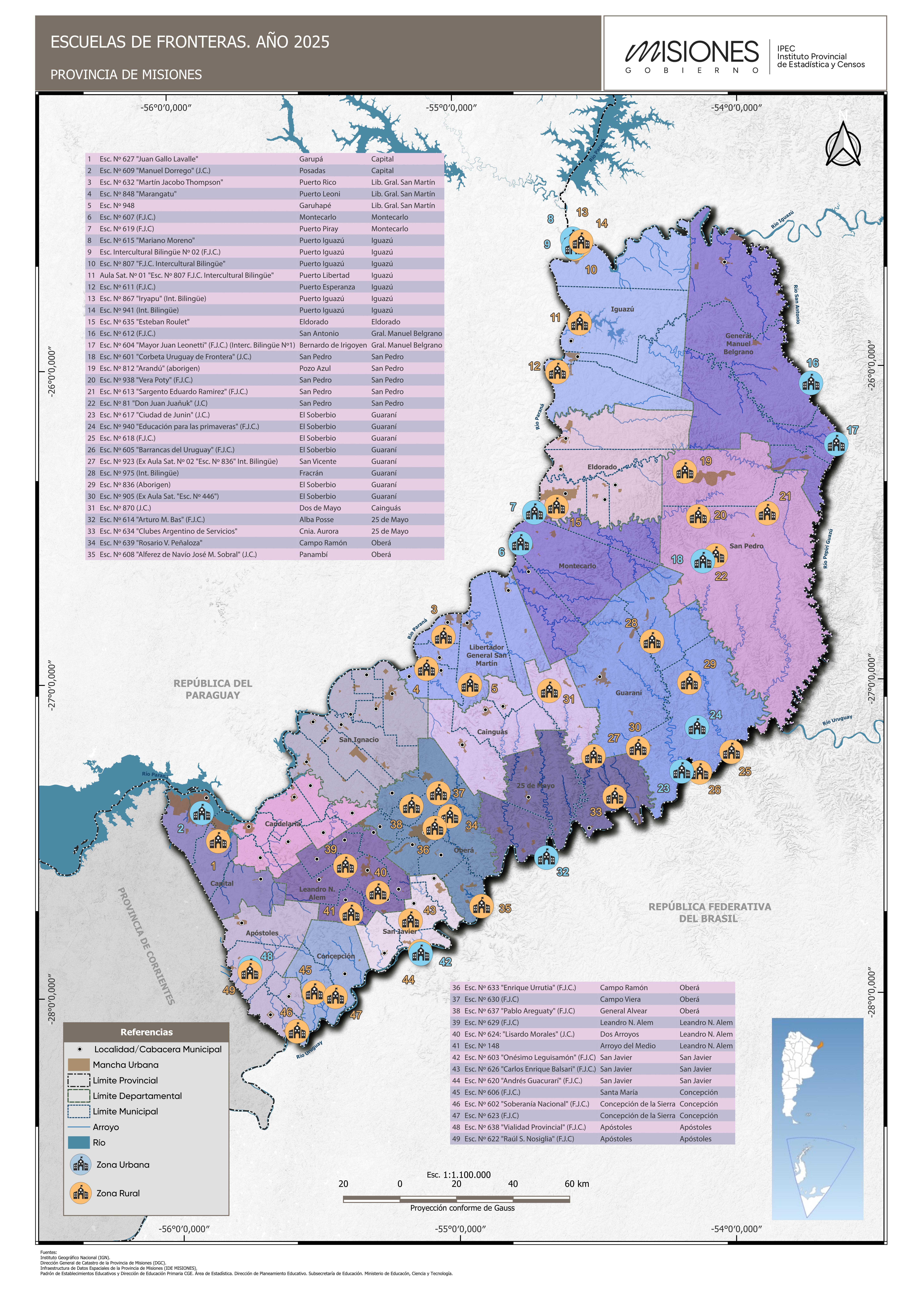 EL IPEC Escuelas de fronteraEL IPECServicios y herramientasMapotecaEscuelas de frontera 06/04/2026Facebook Twitter WhatsApp Imprimir Mapa de Escuelas de frontera. Año 2025. Provincia de Misiones. PDFMapa de Escuelas de frontera. Año 2025. Provincia de Misiones. JPG Información relacionada Información destacadaMapa político escolar de Misiones actualizado EL IPECPoblación Rural por municipio EL IPECPoblación por municipio EL IPECDensidad de población por municipio EL IPECViviendas particulares por municipio