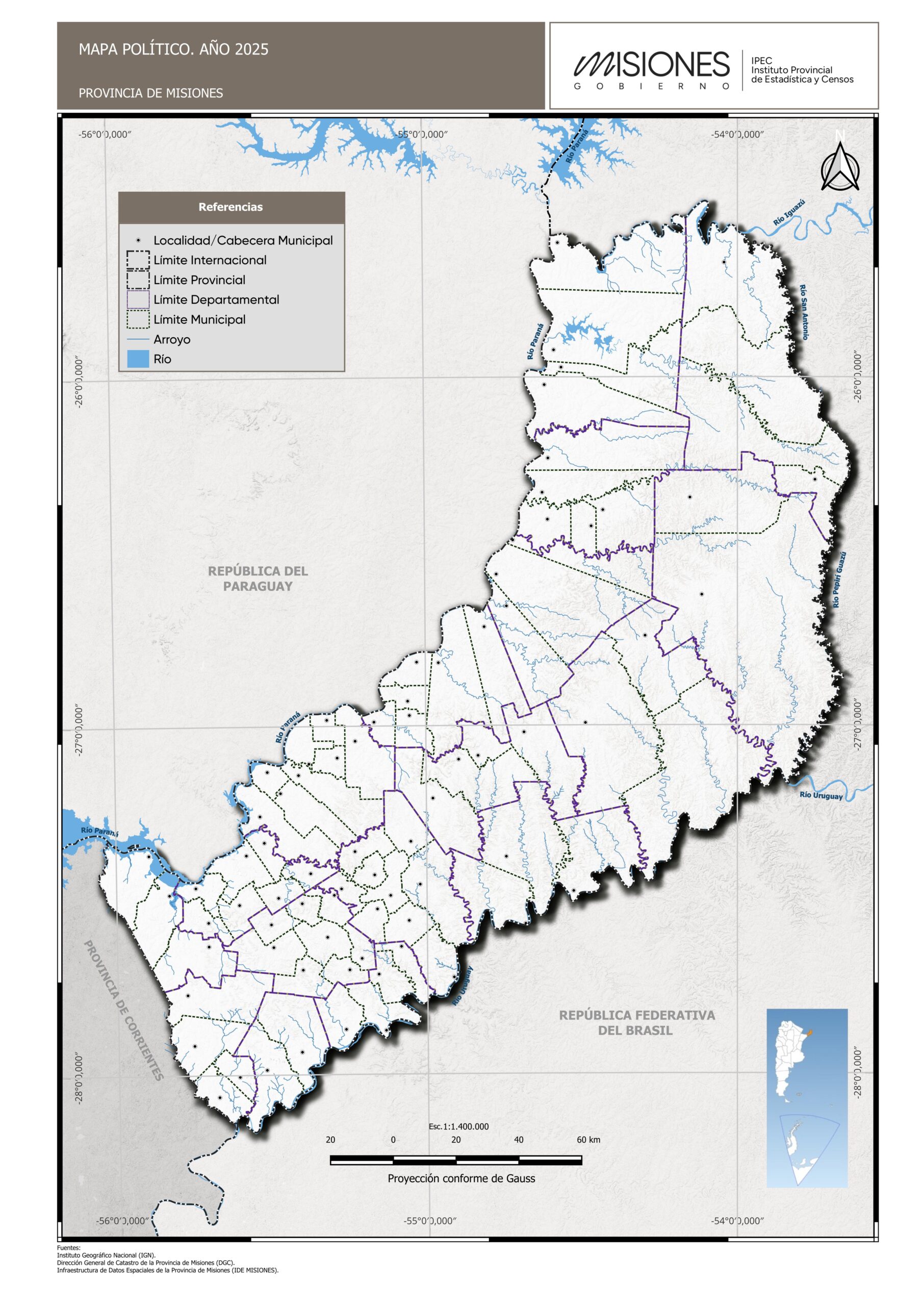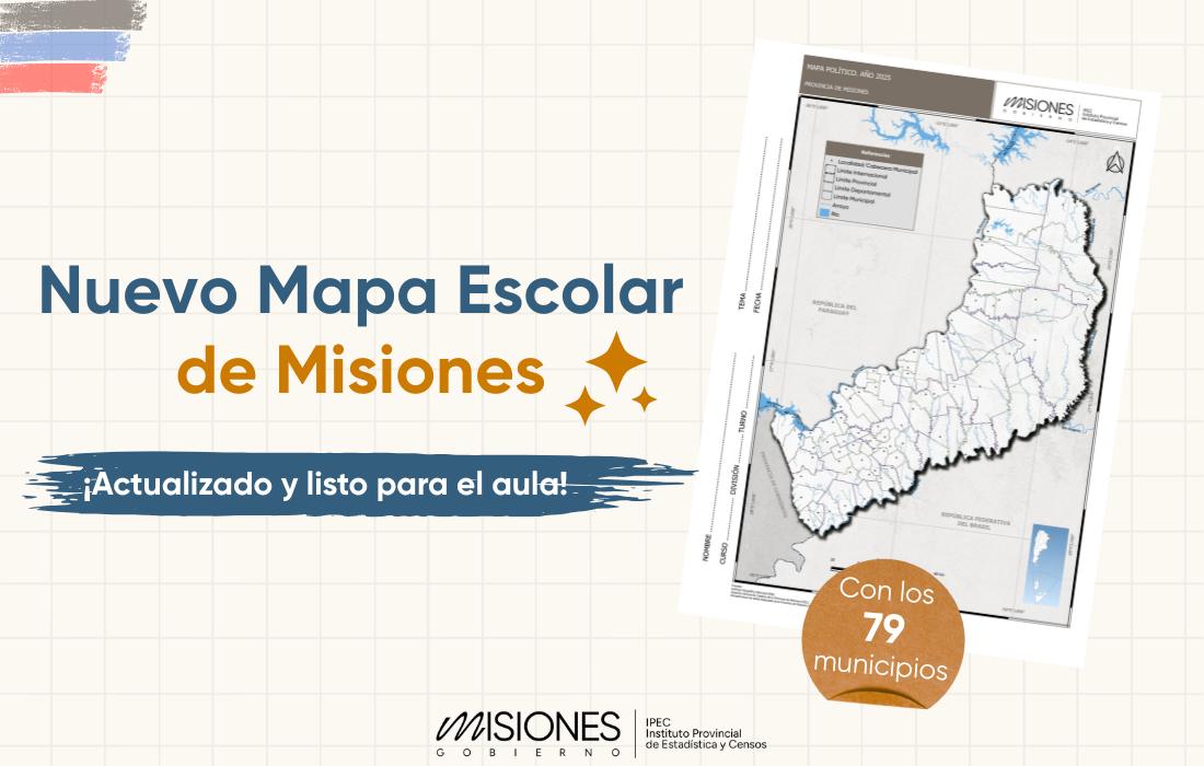 El Instituto Provincial de Estadística y Censos (IPEC) presenta un mapa político de la provincia de Misiones en formato escolar, diseñado como recurso pedagógico para estudiantes y docentes.